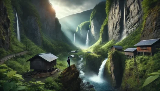 ・神官イクスの谷底:第7話や最終話で描かれる、外界から隔絶された谷底。切り立った岩壁や滝、簡素な住居など、日本の深山幽谷の風景が重なります。